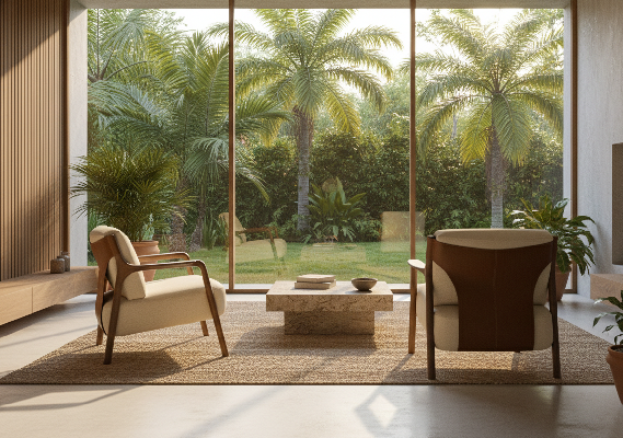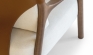 Seu desenho é orgânico e acolhedor, quase primordial, como um grão antes de romper a terra. A madeira guarda memória; o couro, trabalhado com precisão, carrega o gesto humano e o tempo vivido.