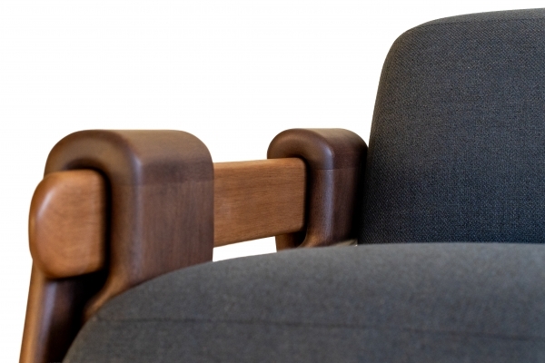 A Artemis explora a ideia de envolver a estrutura em madeira ao redor dos braços da poltrona, criando a ilusão da madeira maciça como algo maleável. Os pés, de traços puros e retos, evitam competir visualmente com os braços, os protagonistas da peça. Os grandes botões metálicos valorizam os pés e conduzem o olhar ao ponto mais surpreendente: os braços elegantemente enrolados.